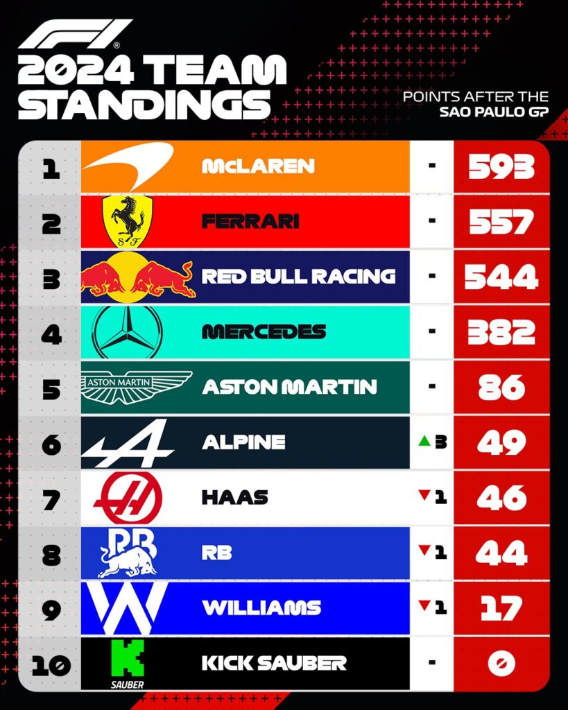 En la lucha entre escuderías, McLaren sigue liderando con 593 puntos, seguido de Ferrari con 557 y un Red Bull que se acerca con 544, gracias a la victoria de Verstappen. Los pilotos de Alpine, Esteban Ocon y Pierre Gasly, sorprendieron con un excelente desempeño, subiendo al podio junto a Verstappen, lo que impulsó a su escudería al sexto lugar en el campeonato de constructores.